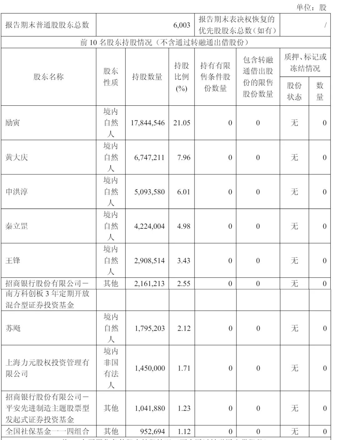 黄大庆持股7.96%,王锋持股为3.43%,招商银行股份有限公司-南方科创板 3 年定期开放混合型证券投资基金持股为2.55%;