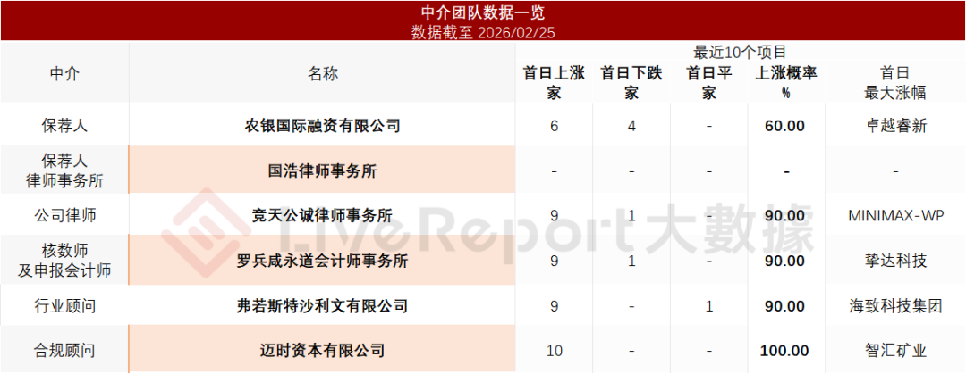 据LiveReport大数据统计,华依科技中介团队共计6家,其中保荐人1家,近10家保荐项目数据表现有待提升;公司律师共计2家,综合项目数据表现值得肯定。整体而言中介团队历史数据表现可靠。