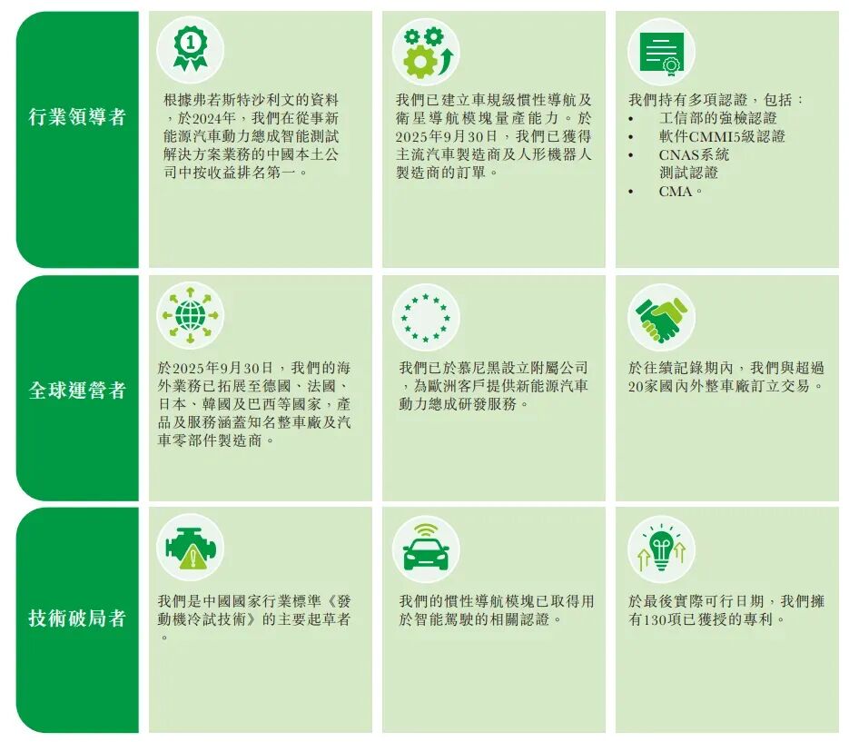 公司的智能驾驶业务包括智能驾驶测试服务及制造高精度定位产品。就测试而言,公司已开发多元化的专业场景,以满足整车ADAS性能测试要求;就产品而言,公司提供涵盖惯性导航、卫星导航及高精度定位的产品组合,为智能驾驶系统的智能感知层提供支撑。