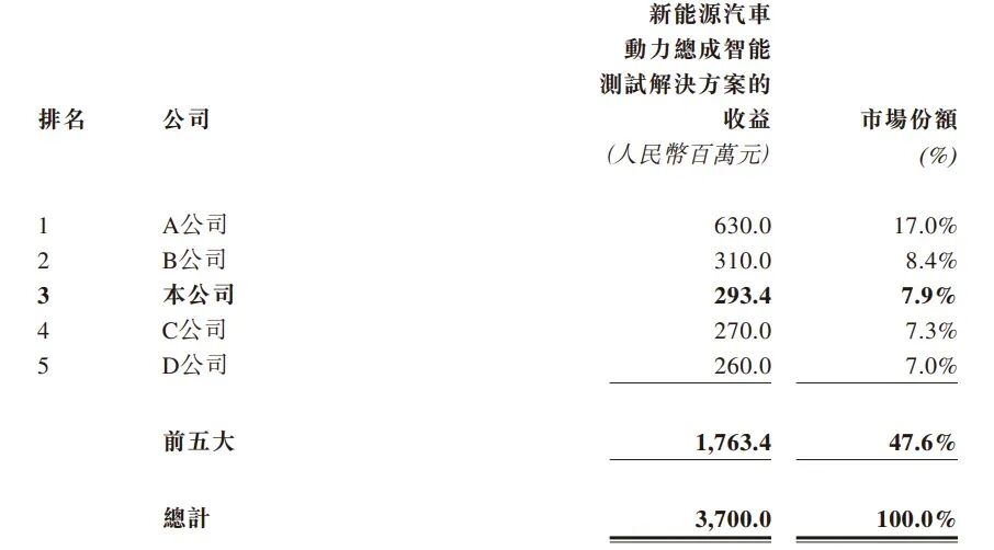 中国新能源汽车动力总成智能测试解决方案市场较为集中,于2024年,前五大公司占市场份额约[47.6]%。于2024年,公司为中国[第三大]新能源汽车动力总成智能测试解决方案供应商,市场份额为[7.9]%。