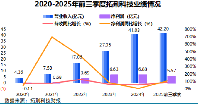 其中,拓荆科技的PECVD(等离子体增强化学气相沉积)设备是其王牌产品,成功打破了海外巨头长达数十年的垄断。正是依靠这项核心技术,公司实现了惊人的增长。营收从2020年不到5亿元,飙升至2024年的41亿元,年复合增速高达75%。利润2025年前三季度净利润同比暴增超105%。