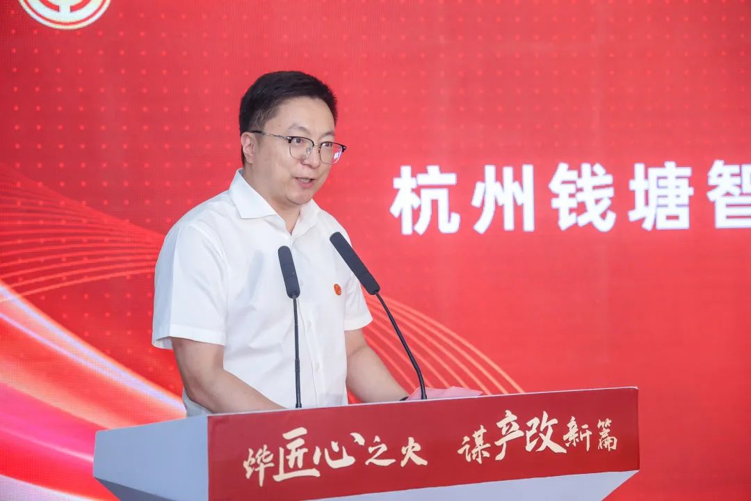 钱塘智慧城党工委书记冯磊致辞并作“创智工匠”服务中心介绍。他表示,智慧城总工会始终致力于造就一支与高质量发展相适应的高素质产业工人队伍,“创智工匠”服务中心是为赋能产业工人成长成才、职业发展、美好生活而搭建的具有新时代特色的综合服务平台。让我们扎根在上城区这片创业创新的热土,在制造强国的火热实践中共创共富典范城区。