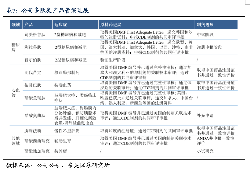 基于6大研发平台,小分子化药管线丰富。除多肽规模化生产技术平台和多肽类新药研发技术平台外,公司搭建了手性药物技术平台、绿色工艺技术平台、制剂给药技术平台、寡核苷酸研发中试平台等6大行业领先的核心技术平台,相关核心技术均为公司现有研发团队自主研发取得。除多肽类产品外,公司拥有丰富的小分子化药管线,涵盖原料药和制剂、仿制药和新药。根据2023年报,公司新获批3个药品注册批件(奥美沙坦酯氨氯地平片、注射用比伐芦定、氨氯地平阿托伐他汀钙片),有在研项目37项,其中原料药21项、制剂16项,并有12个原料药品种的美国DMF/VMF编号,可满足下游制剂客户在FDA的申报需求。进度较快的管线包括1个国内原料药上市申请批准通知书,6个原料药品种在美国通过与制剂的关联技术审评,另有4个制剂品种和5个原料药品种正在CDE的审评审批中,有望实现收益的较快转化。