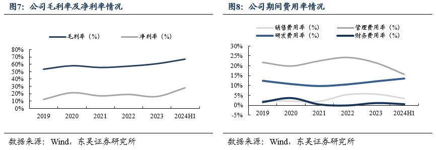 毛利率呈现增长态势,研发费用率逐年上涨。利润率方面,公司主营业务综合毛利率整体呈现上升趋势,2023年毛利率61%。2021年公司CDMO和CMO业务受到人工费和制造费用增加的影响,导致毛利率有所下降。2022-2023年,主营业务毛利率较高,主要因为自主选择产品业务占比结构增大;随着后续自主选择产品业务贡献较大部分公司盈利,我们判断毛利率将维持较高水平,随着产能扩大有望进一步提升。期间费用率方面,公司高度重视研发投入,使公司保持了稳定的产品质量和持续的技术领先,研发费用率自2021年起逐年增长,2024H1达13.5%。销售费用率保持较低水平,2024H1进一步下降至3.5%,主要是公司市场不断拓展、销售规模、销售体系完善,具备较强品牌力。2020 年以来管理费用总额有所增长主要系公司规模不断扩大,管理人员工资及折旧费用等有所增加所致。
