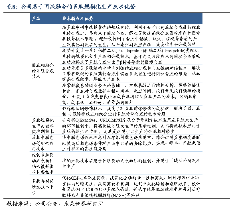 公司拥有多肽领域领先优势,基于固液融合技术,产品纯度高且成本低;具备大规模化生产能力,实现超10公斤的单批产量。在多肽药物领域,(1)公司实现合成、纯化及生产控制等各方面的技术突破,建立了基于固液融合的多肽规模化生产技术平台,在产品收率、合成效率和质量较传统固相合成技术大幅提升,司美格鲁肽、利拉鲁肽、替尔泊肽和兰瑞肽的纯度都在99%以上,收率30%以上,杂质数量和含量均小于原研,新增杂质均小于0.1%,产品质量优于原研。(2)因此,生产成本大幅降低。比如公司利拉鲁肽验证批生产的单位成本大幅下降,2018-2020 年度公司利拉鲁肽系列产品的平均销售成本分别为450.35、63.02、63.02万元/kg,毛利率分别为52.15%、88.51%、88.31%,实现生产成本的大幅下降。(3)公司掌握控制多肽药物比表面积的纳米缓释微粉制备技术,并用于兰瑞肽的开发及大生产。(4)长链多肽药物的规模化大生产技术壁垒极高,目前行业内绝大多数厂家仅能达到单批量克级、百克级的水平;而公司突破了长链多肽药物规模化大生产的技术瓶颈,具备侧链化学修饰多肽、长链修饰多肽数公斤级的大生产能力,如司美格鲁肽、艾博韦泰等长链修饰多肽药物的单批次产量已超过10公斤,达到行业先进水平。