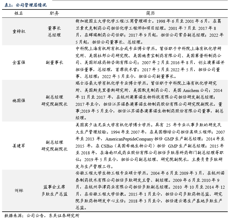 公司管理层行业经验丰富,核心管理层架构稳定。公司现任董事长童梓权硕士毕业于新加坡国立大学化学工程与工商管理专业,曾任职于葛兰素史克、辉瑞等知名制药公司,具有丰富的技术经验和管理经验;副董事长金富强是教授级高级工程师,先后在国内外多家研究所、药企任职,从业经验深厚,并于2007年创立澳赛诺;其余高管均深耕行业多年,经验丰富。整体看,公司核心管理层架构稳定,利于公司的长期稳定发展。