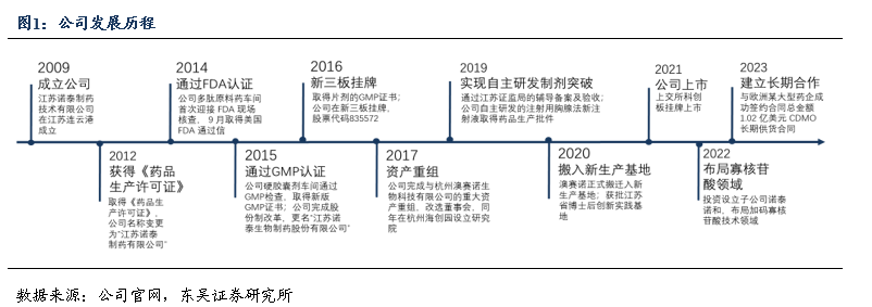 公司在2009年成立于江苏省连云港市,是一家聚焦多肽药物及小分子化药进行自主研发与定制研发生产相结合的生物医药企业。在高级医药中间体、原料药到制剂的各个领域,公司积极进行产品研发和业务拓展,深耕细分领域,聚焦多肽业务,自主选择产品和定制产品双轮驱动。自主选择产品方面,公司围绕糖尿病、心血管疾病、肿瘤等疾病治疗方向,以多肽药物为主、以小分子化药为辅,自主选择具有较高技术壁垒和良好市场前景的仿制药药品(包括原料药及制剂)。公司自主研发产品已搭建了丰富的产品管线,涵盖司美格鲁肽、利拉鲁肽、替尔泊肽、醋酸兰瑞肽、磷酸奥司他韦、胸腺法新、依替巴肽等知名品种。定制类产品及技术服务方面,公司利用较强的研发与合成能力在艾滋病、肿瘤、关节炎等多个重大疾病领域,采用定制研发+定制生产的方式,每年为全球创新药企提供高级医药中间体或原料药的定制研发生产服务(CDMO),解决其创新药品研发过程中的技术瓶颈、生产工艺路径优化及放大生产等难题,有效提高下游客户新药研发效率,降低其新药研发生产成本。