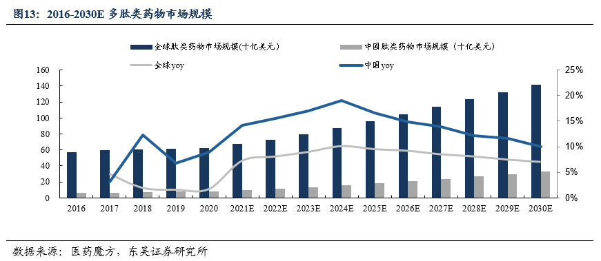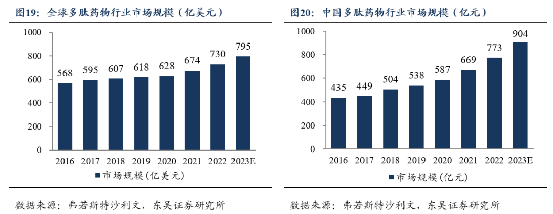 全球及中国多肽药物市场规模持续增长。据弗若斯特沙利文数据,全球多肽药物市场规模从2016年的568亿美元上升至2020年的628亿美元,CAGR为2.6%,预计2023年达到795亿美元。中国多肽类药物行业市场规模呈现快速增长趋势,从2016年的435亿元上升至2020年的587亿元,CAGR达8%,远超全球增速,未来市场规模将进一步扩大,预计2023年达904亿元。