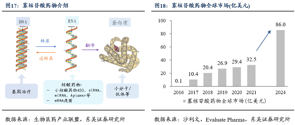 寡核苷酸市场发展迅速,预计2024年达86亿美元。寡核苷酸药物又称小核酸药物,其与mRNA药物是组成核酸药物的两大细分。目前,市场研究较为热门的寡核苷酸药物主要为反义核酸药物(ASO)和小干扰核酸药物(siRNA),是作用于pre-mRNA或mRNA,通过干预靶标基因表达实现疾病治疗目的。与传统的小分子药物和抗体药物相比,核酸药物具有治疗效率高、药物毒性低、特异性强等优点,有望成为继小分子药物和抗体药物后的第三大类药物。根据沙利文统计,小核酸行业规模从2016年的0.1亿美金增至2021年的32.5亿美金,期间CAGR高达217.8%;根据Evaluate Pharma和BCG统计分析,预计2024年全球小核酸市场规模将会达86亿美元。未来随着临床阶段产品的不断上市,修饰技术和递送技术的不断发展,适应症从遗传病等小人群适应症扩大到广泛人群适应症,整体市场将继续保持快速增长。
