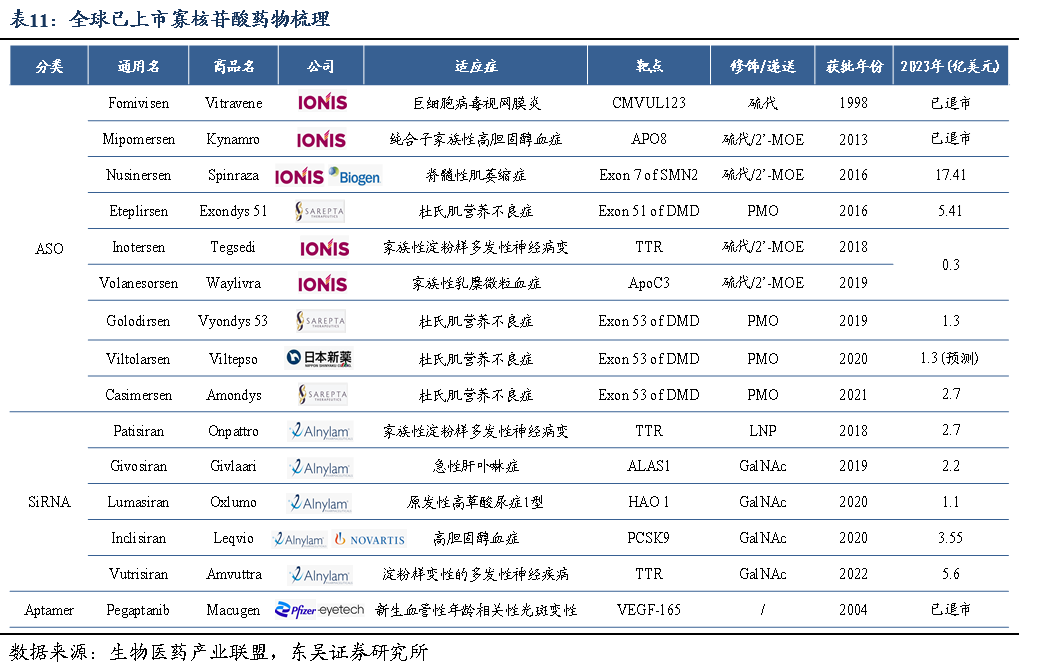 获批上市的寡核苷酸药物销售业绩增长较快。具代表性的是由Ionis公司研发的用于治疗脊髓性肌萎缩症的Nusinersen,上市后到2020年前该药物共产生了47亿美元的销售收入,2021年销售收入19.51亿美元,是目前销售额最高的寡核苷酸药物。此外由Alnylam研发的用于治疗遗传性转甲状腺素蛋白淀粉样变性的Patisiran在上市后第一年2019年也取得了1.5亿美元的销售收入。随着化学修饰与递送技术不断突破,寡核苷酸产业化瓶颈问题逐渐得以解决,行业步入快速发展期。