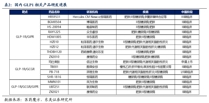 标杆药物的高额经济效益带动GLP-1药物研发端持续火热。目前国内已有十余条管线进入临床及上市申报阶段,并且显现出从单靶点逐步向双靶点和三靶点迭代,从日制剂向周制剂迭代,从注射剂型向口服剂型迭代的特点。从减重效果看,GLP-1R/GCGR/GIPR三靶点减肥药优于双靶点减肥药优于GLP-1R单靶点司美格鲁肽。目前,国内相关产品快速追赶,GLP-1R/GCGR靶点信达生物进度最快,已经处于NDA阶段;GLP-1R/GIPR靶点恒瑞医药、博瑞医药、翰森制药、众生睿创等进度较快;GLP-1R/GCGR/GIPR三靶点研发较早期,只有民为生物进入到II期临床。