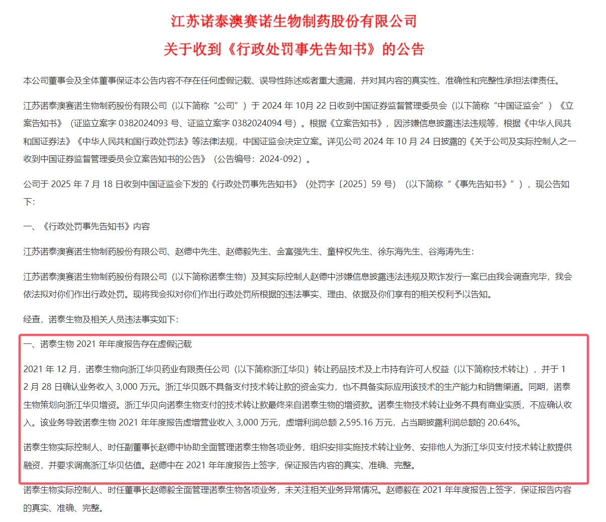 综合上述两项,证监会对江苏诺泰澳赛诺生物制药股份有限公司责令改正,给予警告,并处以4,740 万元罚款;对赵德中给予警告,并处以 1,300 万元罚款,其中作为直接负责的主管人员处以 500 万元罚款,作为实际控制人组织、指使上述行为处以800 万元罚款;对赵德毅给予警告,并处以 500 万元罚款;对金富强给予警告,并处以 330 万元罚款;对童梓权、谷海涛给予警告,并分别处以 300 万元罚款;对徐东海给予警告,并处以 150 万元罚款。