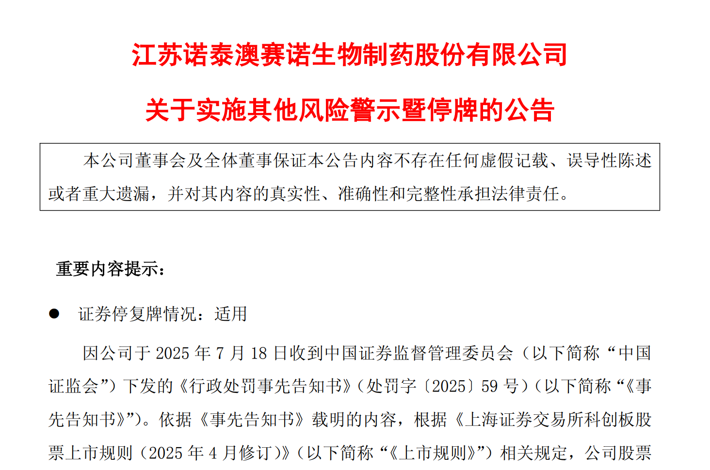 2025年7月19日,ST诺泰发布公告称,因公司收到中国证券监督管理委员会(以下简称“中国证监会”)下发的《行政处罚事先告知书》(处罚字〔2025〕59 号)(以下简称“《事先告知书》”)。依据《事先告知书》载明的内容,根据《上海证券交易所科创板股票上市规则(2025 年 4 月修订)》(以下简称“《上市规则》”)相关规定,公司股票将被实施其他风险警示。