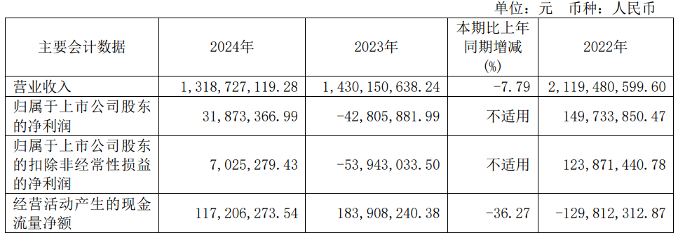 2024年,大地熊实现营业收入13.19亿元,2023年为14.30亿元,2022年为21.19亿元,连续两年下降;归属于上市公司股东的净利润3187.34万元,上年同期为-4280.59万元;归属于上市公司股东的扣非净利润702.53万元,上年同期为-5394.30万元;经营活动产生的现金流量净额为1.17亿元,同比下降36.27%。