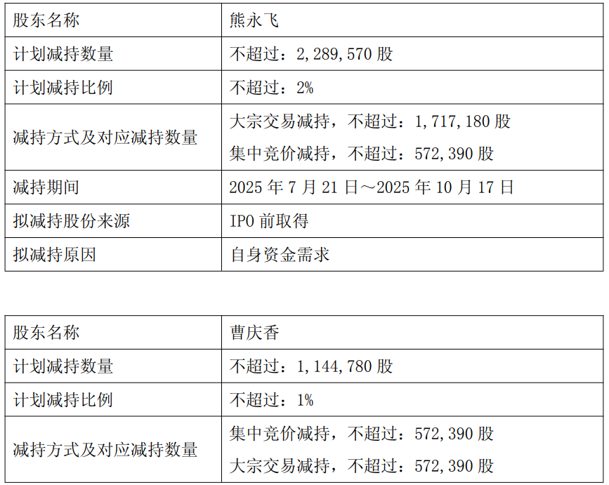 因股东自身资金需求,公司控股股东、实际控制人、董事长、总经理熊永飞拟减持其所持有的公司股份不超过2,289,570股,占公司总股本的比例不超过2%;公司实际控制人、董事曹庆香拟减持其所持有的公司股份不超过1,144,780股,占公司总股本的比例不超过1%。熊永飞、曹庆香系夫妻关系。