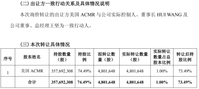 2026年2月,公司控股股东美国ACMR因自身资金需求,以询价转让的方式减持公司股份。本次询价转让的价格为160元/股,转让的股票数量为480.16万股(占公司总股本的1%),控股股东由此套现7.68亿元。本次权益变动后,美国ACMR及其一致行动人HUI WANG、王坚合计持有盛美上海股份比例将由74.84%减少至73.72%。