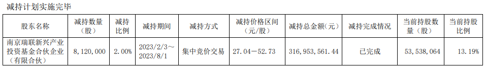 昨日晚间,虹软科技(688088)发布公告称,公司于昨日收到瑞联新产业发来的《告知函》,截至2023年8月1日,南京瑞联新兴产业投资基金合伙企业(有限合伙)(以下简称“瑞联新产业”)以集中竞价交易方式累计减持公司股份数量8,120,000股,占公司总股本的2.00%。瑞联新产业本次减持计划已实施完毕。