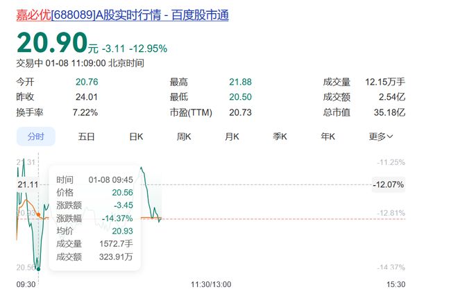 1月8日,嘉必优(688089)开盘暴跌超14%,截至上午11时许,嘉必优报20.90元/股,跌12.95%。