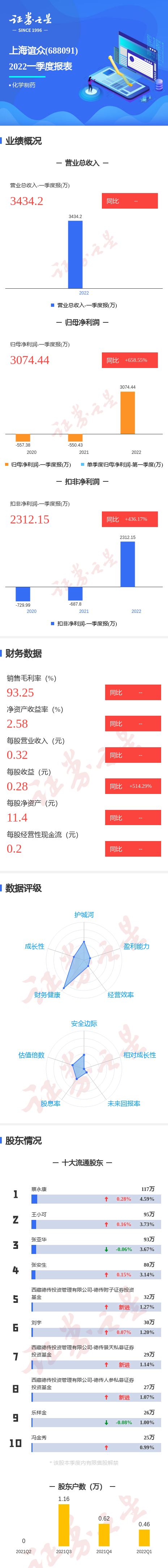 上海谊众2022一季报显示,公司主营收入3434.2万元,归母净利润3074.45万元,同比上升658.55%;扣非净利润2312.16万元,同比上升436.17%;其中2022年第一季度,公司单季度主营收入3434.2万元,单季度归母净利润3074.45万元,同比上升658.55%;单季度扣非净利润2312.16万元,同比上升436.17%;负债率0.88%,投资收益532.05万元,财务费用-123.49万元,毛利率93.25%。