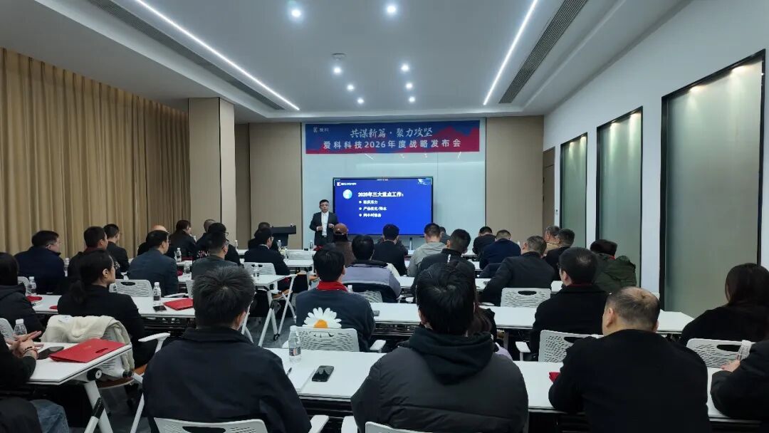 2025年12月27日, 爱科科技 以“共谋新篇?聚力攻坚”为主题的2026年度战略发布会顺利召开,公司全体管理人员齐聚一堂,完成了新年度战略蓝图的集中发布与攻坚方向的统一锚定。本次发布会既是前期多轮战略研讨、思维碰撞成果的落地呈现,更是企业在行业竞争加剧、外部环境复杂的背景下,明确发展航向、凝聚全员共识的关键举措。