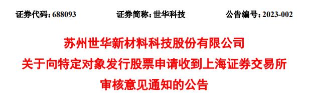 中国经济网北京2月10日讯苏州世华新材料科技股份有限公司(简称“世华科技”,688093.SH)昨晚发布关于向特定对象发行股票申请收到上海证券交易所审核意见通知的公告。世华科技于2023年2月9日收到上海证券交易所出具的《关于苏州世华新材料科技股份有限公司向特定对象发行股票审核意见的通知》,具体意见如下: