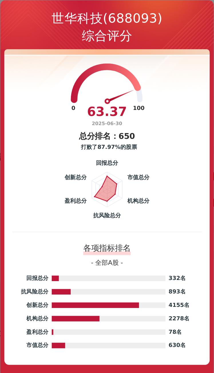 金融界上市公司研究院构建了一套上市公司韧性评价体系,从企业盈利、科技创新、股东回报、经营抗风险、市值表现及机构吸引力六个维度对企业进行量化评分,满分为100分。世华科技的韧性评价总分为63.37分,在A股5405家可比上市公司中排名第650位。