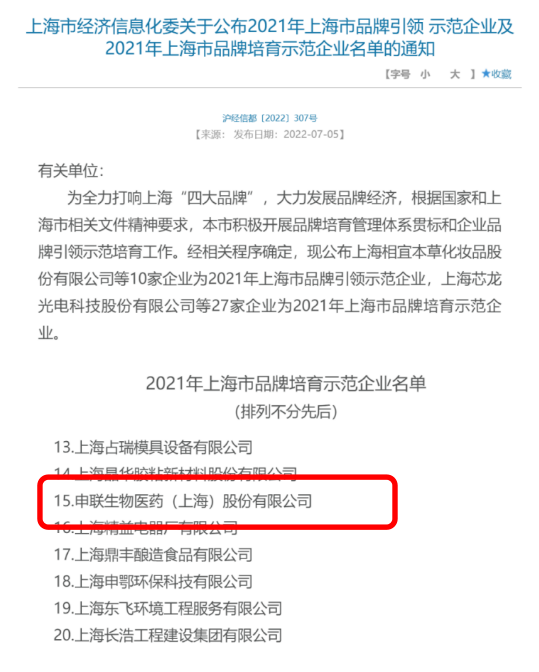 7月5日,2021年上海市品牌引领示范企业及2021年上海市品牌培育示范企业名单公布,申联生物医药(上海)股份有限公司喜获“2021年上海市品牌培育示范企业”殊荣。上海市品牌培育示范企业评选由上海市经济和信息化委员会主办,是上海市落实“四大品牌”三年行动计划项目,旨在增强企业品牌意识,提升企业品牌培育管理能力,大力发展品牌经济,打响“上海制造”品牌。
