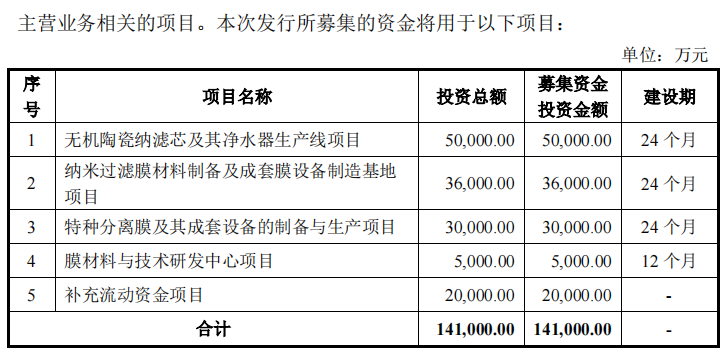 值得一提的是,“无机陶瓷纳滤芯及其净水器生产线项目”同样用于扩充产能,达产后将新增328万支纳滤芯、62万台纳滤芯净水设备的生产能力,科创板上市委曾在审议会议上要求公司进一步说明该项目的技术先进性。