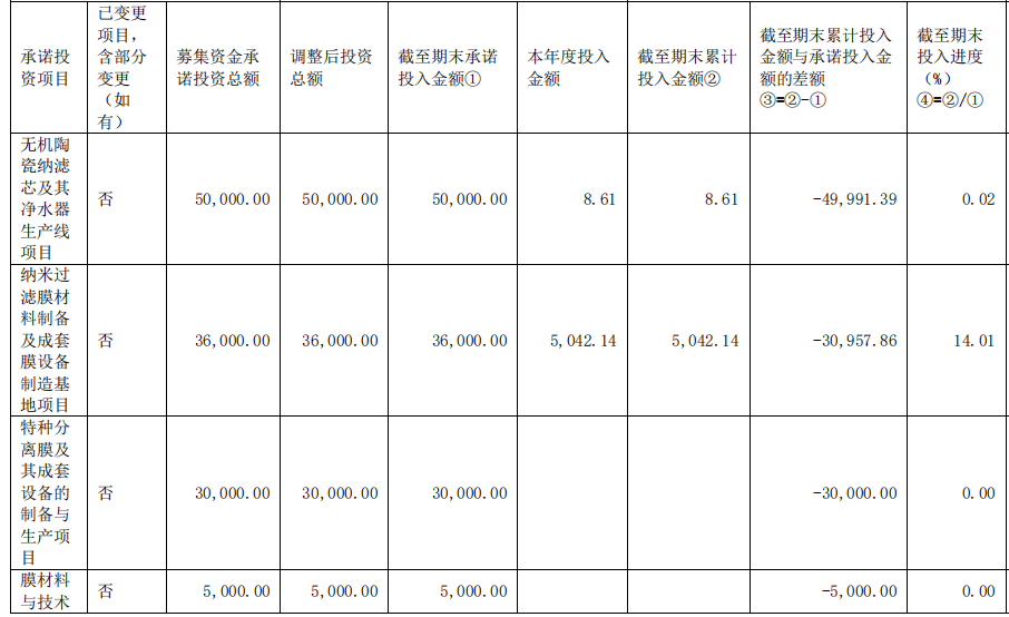 但据2020年年报披露,截至2020年末,“纳米过滤膜材料制备及成套膜设备制造基地项目”的累计投入金额为5042.14万元,建设进度仅为14.01%。