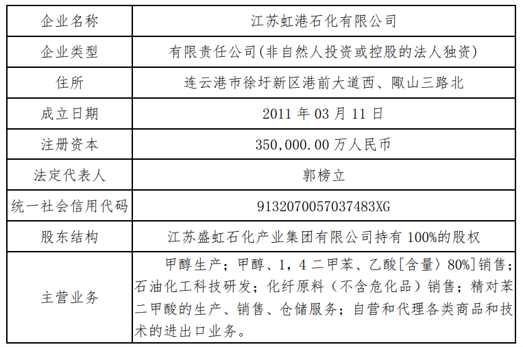 江苏虹港石化有限公司经营范围为甲醇生产;甲醇、1,4 二甲苯、乙酸[含量〉80%]销售;石油化工科技研发;化纤原料(不含危化品)销售;精对苯二甲酸的生产、销售、仓储服务;自营和代理各类商品和技术的进出口业务。