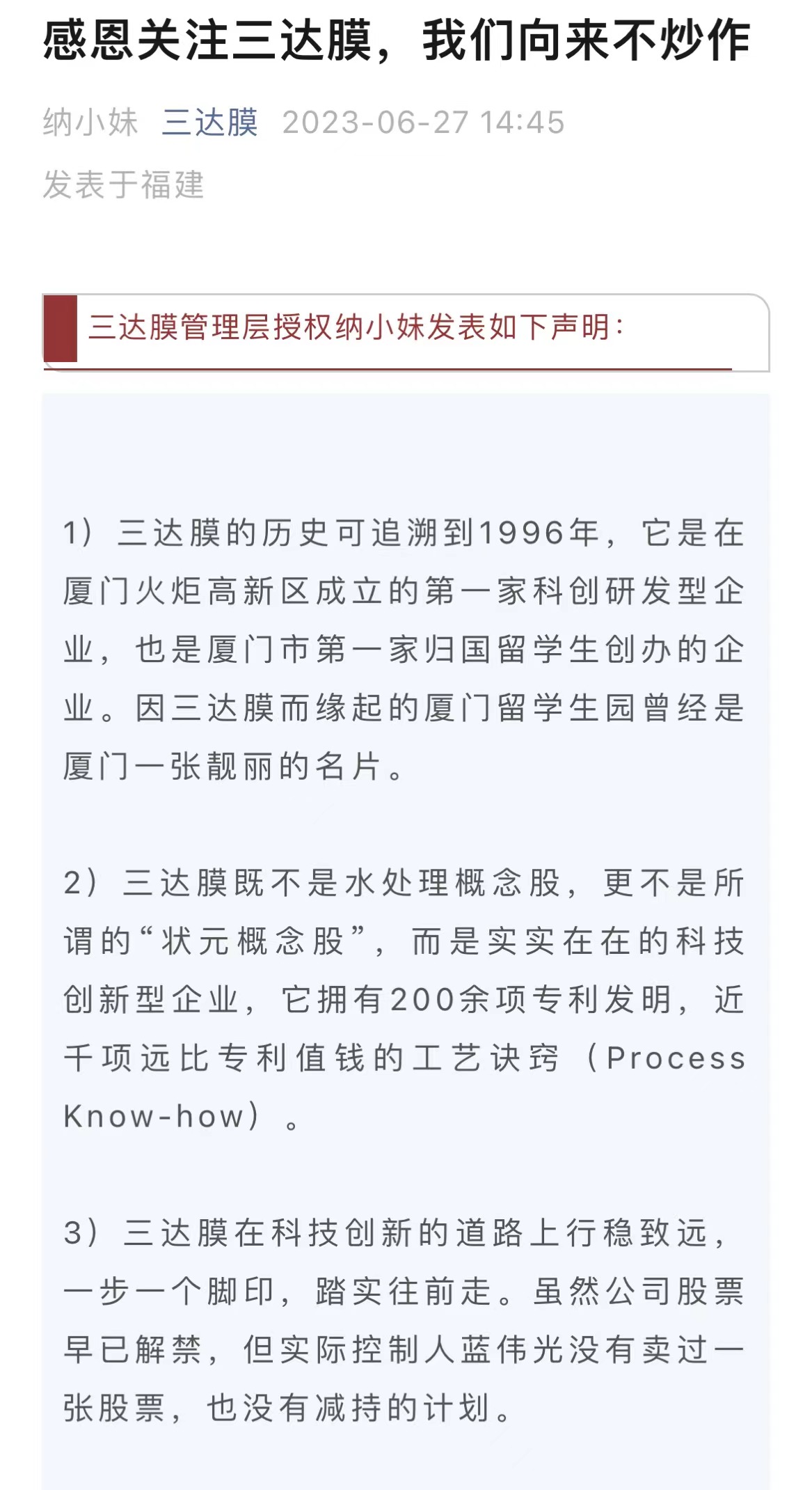 6月27日,三达膜在官微发布题为《感恩关注三达膜,我们向来不炒作》的声明,称三达膜既不是水处理概念股,更不是所谓的“状元概念股”,而是实实在在的科技创新型企业。虽然公司股票早已解禁,但实际控制人蓝伟光没有卖过一股股票,也没有减持计划。