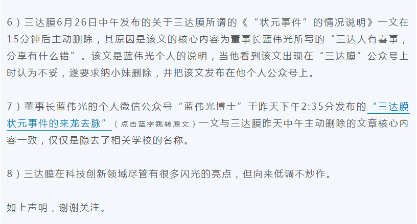 6月25日,董事长蓝伟光的个人微信公众号“蓝伟光博士”发布了《三达膜状元事件的来龙去脉》。