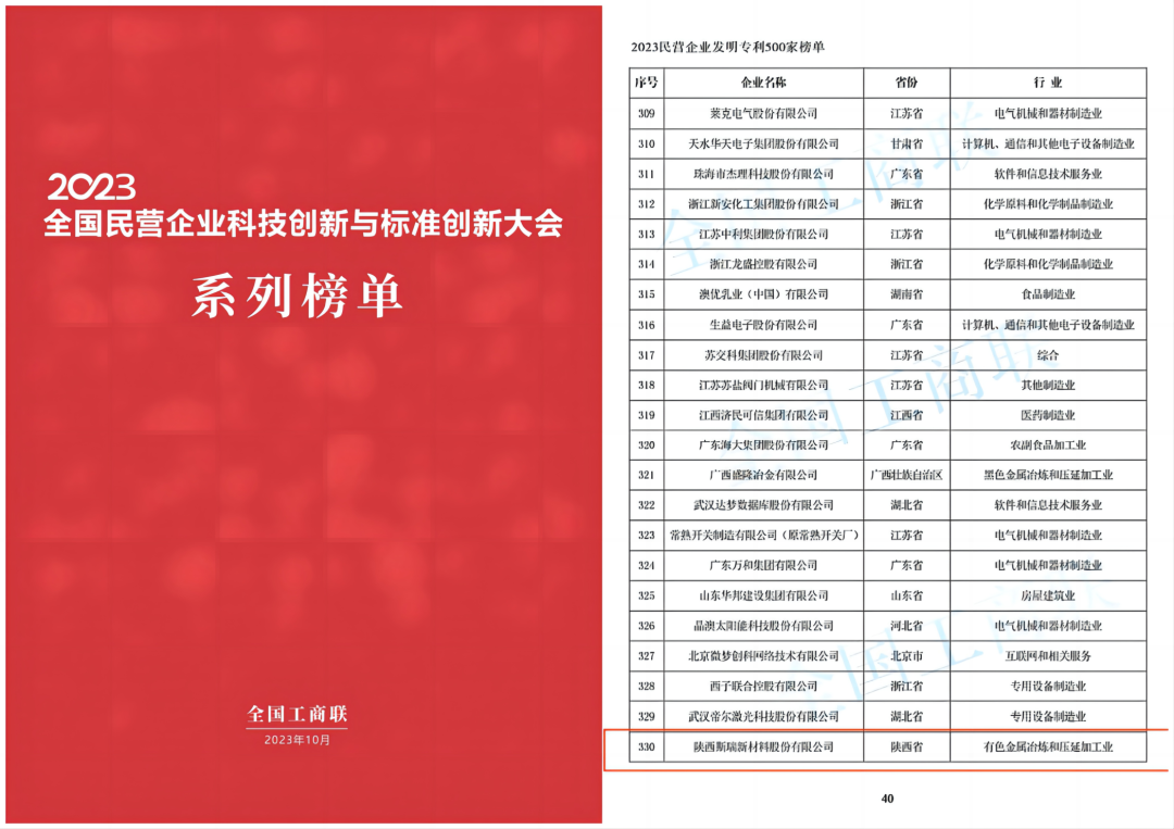 2023年10月20日,2023全国民营企业科技创新与标准创新大会发布了2023民营企业发明专利500家榜单,陕西斯瑞新材料股份有限公司首次上榜。