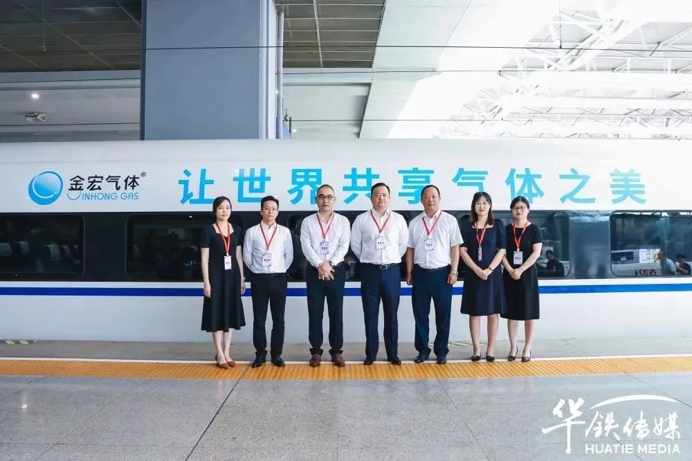 6月16日,金宏气体高铁冠名列车首发仪式在上海虹桥站隆重举行。金宏气体股份有限公司董事长兼总经理金向华、副总经理刘斌、副总经理康立忠、董事会秘书陈莹、助理总经理翁方等出席活动。首发仪式上,车身标有“金宏气体让世界共享气体之美”的列车正式启程。