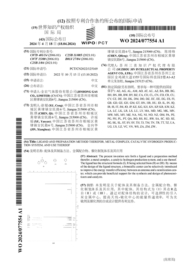 数据显示金宏气体(688106)公布了一项国际专利申请,专利名为“配体及其制备方法、金属配合物、催化制氢体系及其应用”,专利申请号为PCT/CN2022/125169,国际公布日为2024年4月18日。