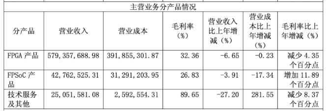 安路科技两大产品线的收入及毛利率均出现下滑。公司主营业务为FPGA、FPSoC芯片和专用EDA软件等产品的研发、设计和销售,产品应用于工业控制、网络通信、消费电子、数据中心等领域。