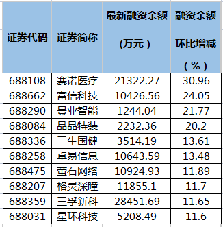 统计显示,5月9日共有233只科创板个股融资余额环比增加。其中,11股融资余额增幅超过10%。融资余额增幅最大的是赛诺医疗,最新融资余额为2.13亿元,环比增幅达30.96%;融资余额增幅较大的还有富信科技、景业智能、晶品特装、三生国健、卓易信息、萤石网络等股。