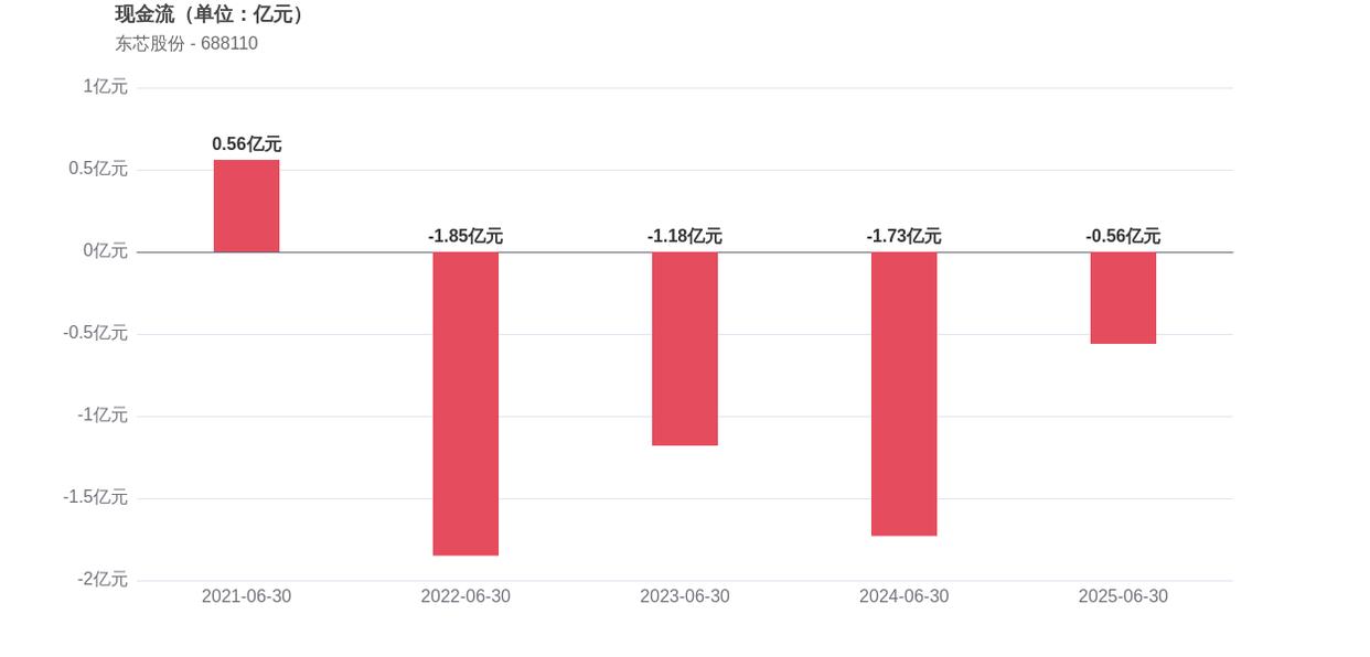 在经营稳健性方面,东芯股份面临存货管理压力,存货周转天数为596.03天,不过较2024年上半年下降了49.36%,表明存货周转效率有所改善。经营活动产生的现金流净额为-0.56亿元,相比2024年同期-1.73亿元有所好转。此外,2025年上半年的资产负债率为5.30%,同比增长0.17个百分点,整体债务水平保持在较低水平。