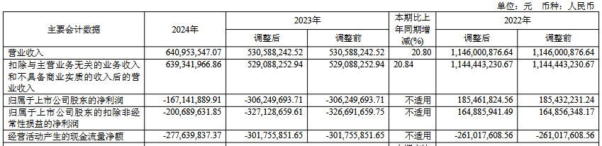 2023年、2024年,公司营业收入分别为5.31亿元、6.41亿元,归属于上市公司股东的净利润分别为-3.06亿元、-1.67亿元,归属于上市公司股东的扣除非经常性损益的净利润分别为-3.27亿元、-2.01亿元,经营活动产生的现金流量净额分别为-3.02亿元、-2.78亿元。