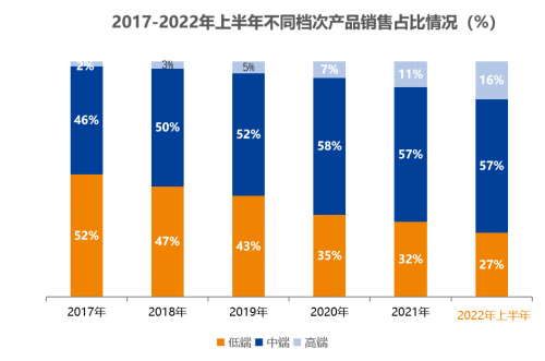 受益于其多年来的高研发投入与高研发转化率,鼎阳目前已经形成 4 项底层技术及 12 项核心技术,获得专利 239 项(其中发明专利 159 项),并成为国内目前唯一一个同时拥有行业四大主力产品并且四大主力产品全线进入高端领域的公司。2022年中报数据显示,鼎阳科技高端产品占比已达16%,且占比提升速度持续加快。上半年鼎阳高端产品系列超常规增长,同比增长达119%,远超中低端产品增速;其中销售均价大于3W的产品系列同比增长225.64%;销售均价大于5W的产品系列同比增长439.55%;射频微波类产品系列同比增长89.40%,高分辨率数字示波器系列同比增长241.89%。
