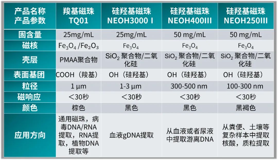 目前,华大智造推出的自研磁珠原料主要有TQ01、NEOH3000Ⅰ、NEOH400Ⅲ和最新推出的NEOH250Ⅲ四款,可针对不同样本类型,将磁珠进行表面修饰后可以与核酸发生特异性吸附,从而实现纯化核酸的目的,得到的提取产物具备产量高、纯度高的优势,能够更好地应用于后续qPCR、测序等检测实验。