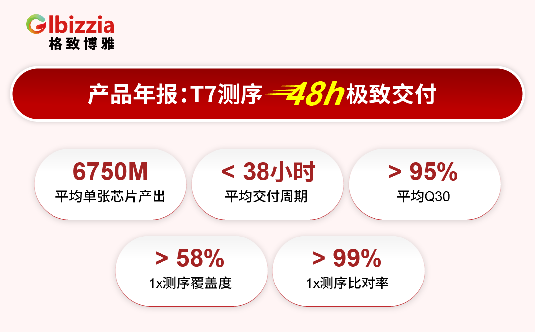 我们始终致力于为客户提供更加优质的服务体验,在实现48小时极速项目交付的同时,严格保障数据产出、数据质量、稳定性、覆盖均匀性以及GC含量均衡度等多项关键指标的优异表现。目前,格致博雅DNBSEQ-T7测序平台年均单张芯片产出超过6700M,平均Q30高于95%,项目交付质量处于业内领先水平。