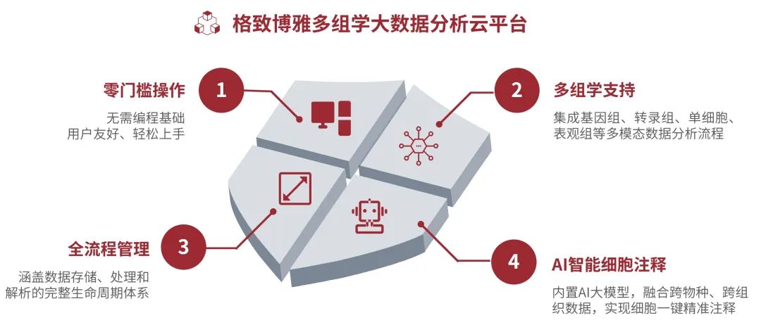 此外,结合格致博雅积累的上万例单细胞样本注释经验以及多个权威细胞注释数据库,平台内置了融合跨物种、跨组织、跨平台数据的单细胞AI细胞注释大模型,实现细胞的一键化精准注释。多组学大数据分析云平台不仅降低了多组学数据分析的门槛,还为育种基础科研提供了强大的技术支持。