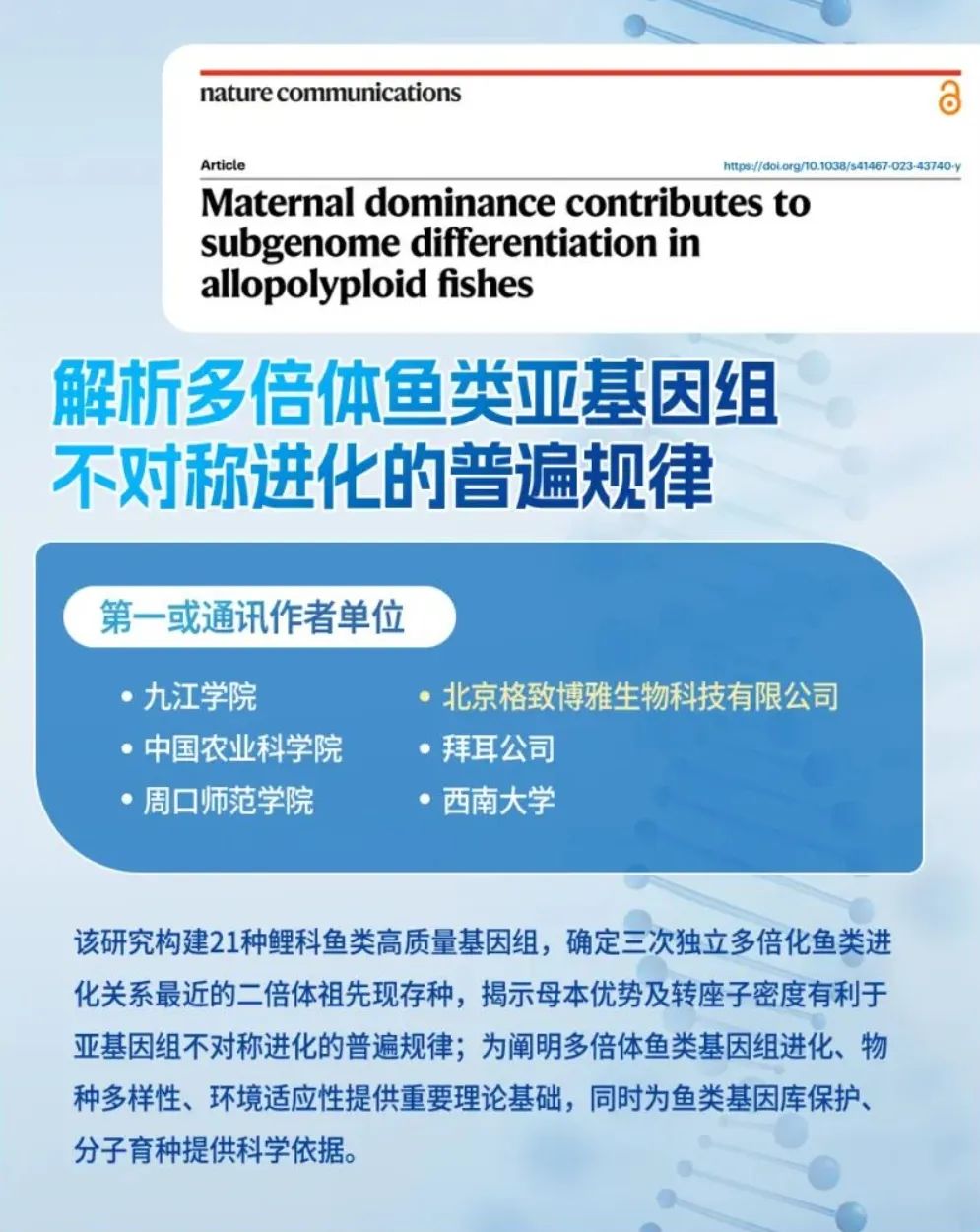2024年,格致博雅以共同一作单位发表的基因组学研究有幸入选“2024中国农业科学重大进展”。该研究构建了21种鲤鱼科鱼类高质量基因组,解析了多倍体鱼类亚基因组不对称进化的普遍规律。2024年公司以共同一作和共同作者单位合作发表了动植物基因组文章多篇,单篇最高影响因子15.8。