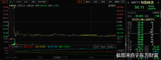 交易行情显示,3月14日,思林杰低开16.28%,开盘价为54.96元/股,开盘后股价震荡下行,盘中最低触及49.8元/股。截至3月14日收盘,思林杰报50.11元/股,跌幅为23.67%,总市值为33.41亿元,全天成交金额为3.47亿元,换手率为44.15%。