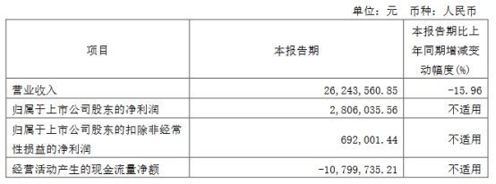 2024年第一季度,公司实现营业收入2624.36万元,同比下降15.96%;归母净利润280.60万元;扣非净利润69.20万元;经营活动产生的现金流量净额为-1079.97万元。