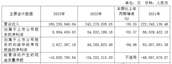 去年,公司营业收入1.68亿元,同比下降30.55%;归母净利润898.44万元,同比下降83.37%;扣非净利润262.74万元,同比下降94.06%;经营活动产生的现金流量净额为-1062.08万元,上年同期为-2425.23万元。