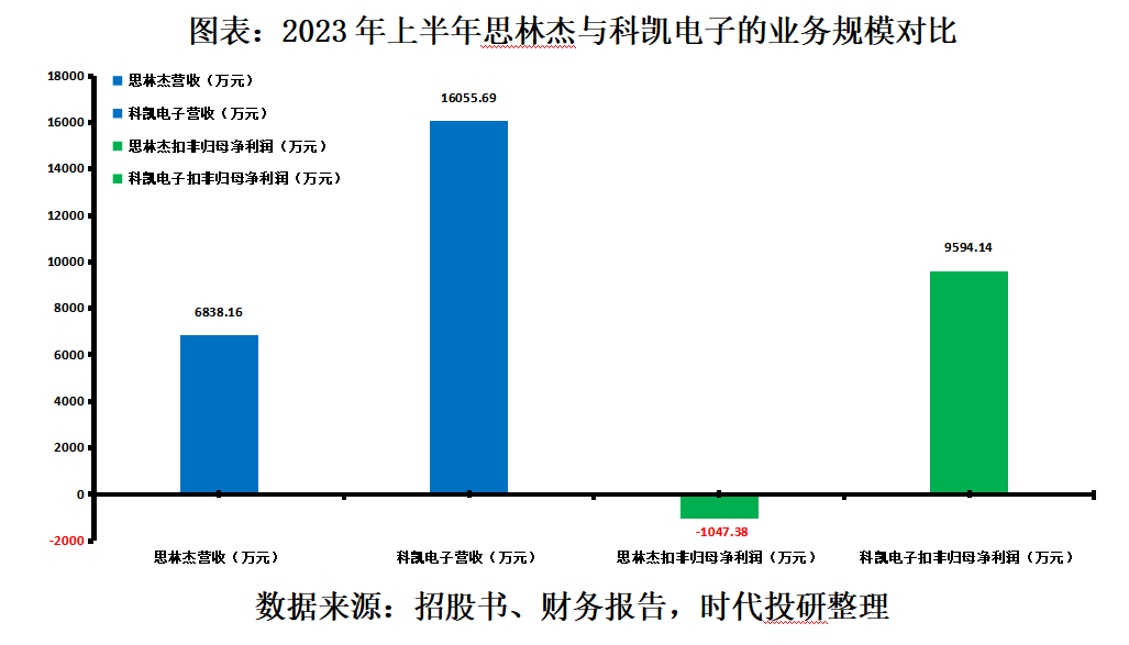 据科凯电子的最新招股书(2024年2月18日签署)显示,2023年上半年,科凯电子的营收为1.61亿元,是思林杰同期营收的2.35倍,扣非归母净利润为9594.14万元,而思林杰同期扣非归母净利润为-1047.38万元。