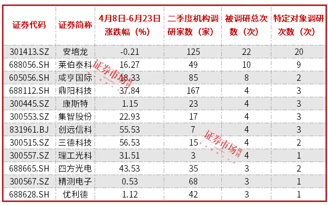 目前来看,安培龙、莱伯泰科、咸亨国际是二季度被调研次数最多的公司,分别达22次、10次、8次。而在机构调研家数上,则是鼎阳科技、精智达、安培龙最多,机构调研家数分别达到167家、141家、125家。当然,相较鼎阳科技、精智达在4月8日以来的37.8%和27.5%涨幅,安培龙表现不佳,同期下跌了0.2%。