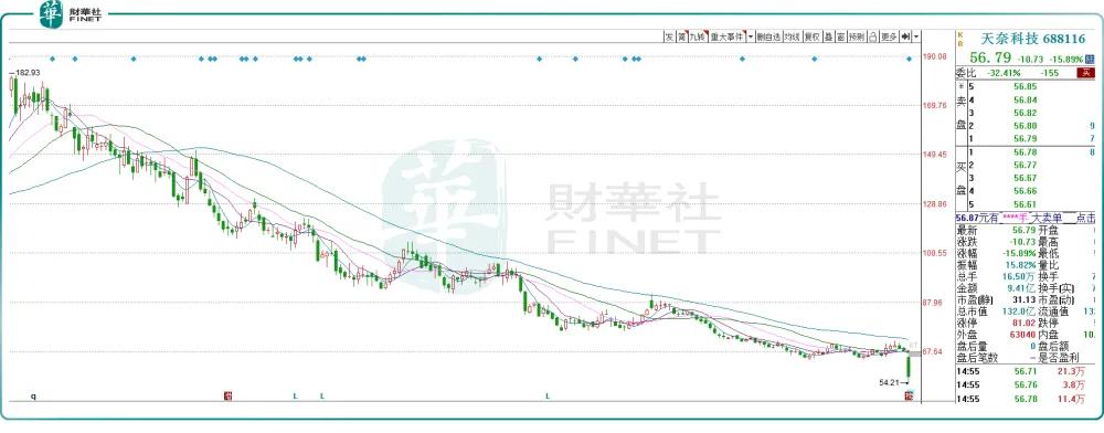 4月20日,天奈科技(688116.SH)跳空放量大跌15.89%,目前公司报收56.79元/股,市值为132亿元。自去年7月份以来,公司股价就进入下行趋势,截至目前累计跌幅约66%,几乎将上市以来的大半涨幅全部抹掉。